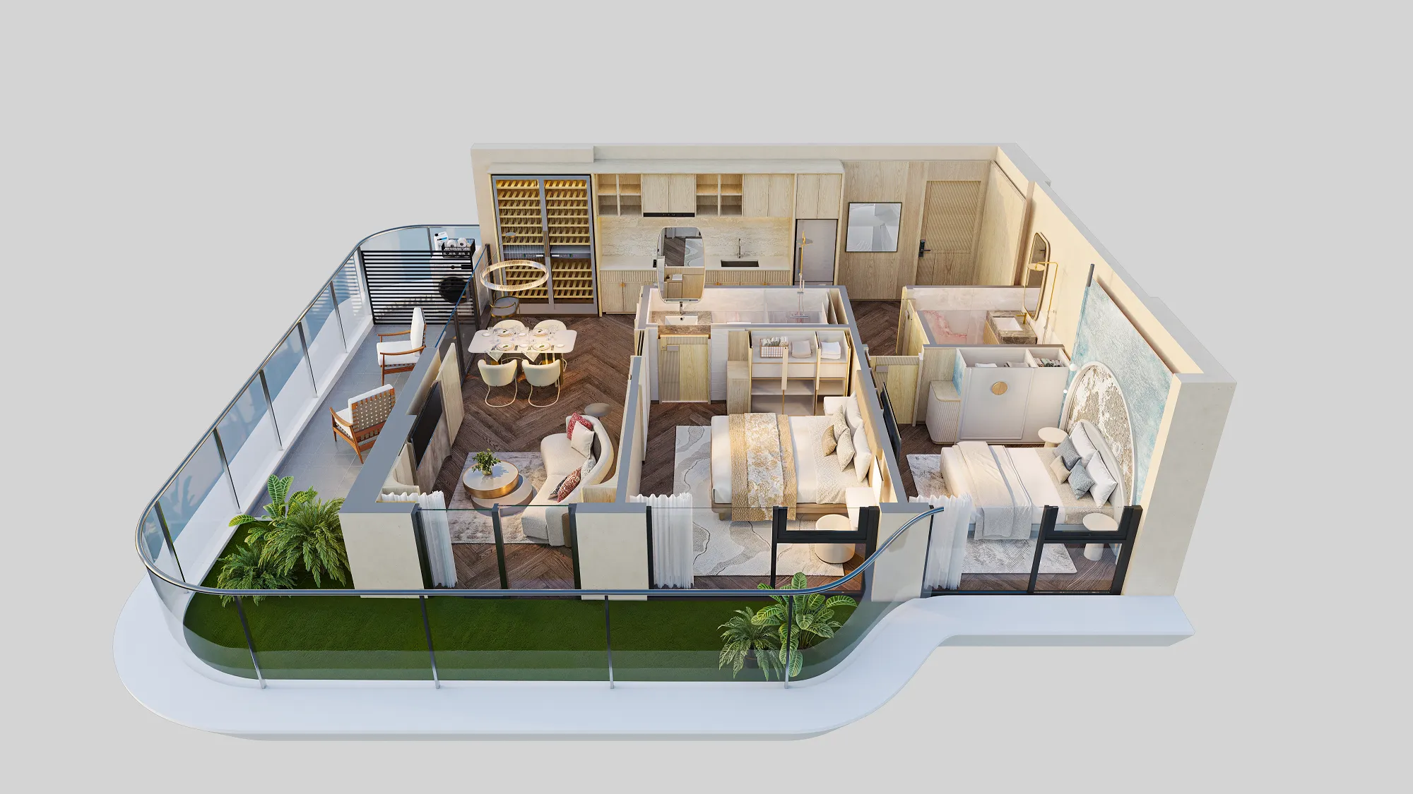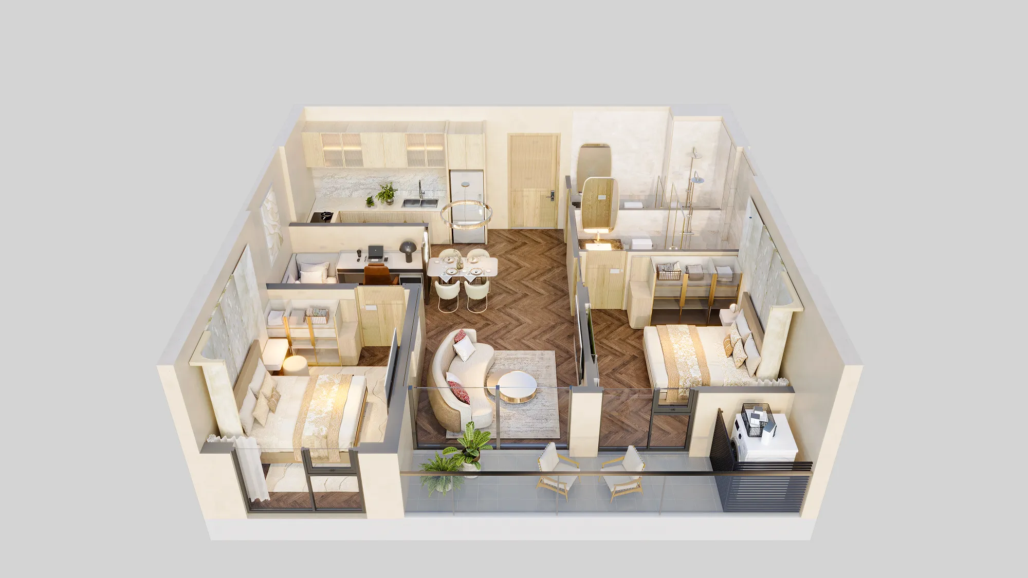 Các căn hộ được thiết kế theo triết lý biophilic – sống giao hòa cùng thiên nhiên, tận dụng tối đa ánh sáng và gió trời, kết hợp cùng nội thất cao cấp, hành lang rộng rãi có điều hòa, tạo nên không gian sống thông minh, tinh tế và giàu cảm xúc. Từng chi tiết được chăm chút để mang đến sự thư thái, tái tạo năng lượng và cân bằng thân – tâm – trí cho cư dân.